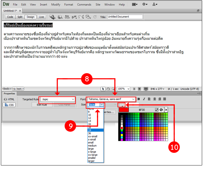 3 ตกแต่งหรือจัดรูปแบบตาม หมายเลข 3-8 (กรณีนี้ สาธิตการกำหนดสีของตัวอักษร)