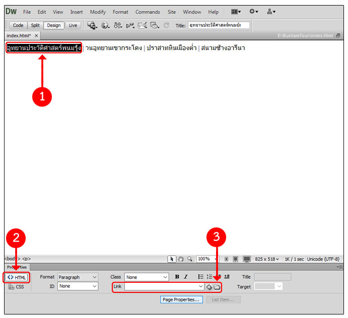 เมื่อเราคลิกที่ลิงค์ "อุทธยานประวัติศาสตร์พนมรุ้ง" จะเปิดหน้าเว็บ panomrung.html ขึ้นมา