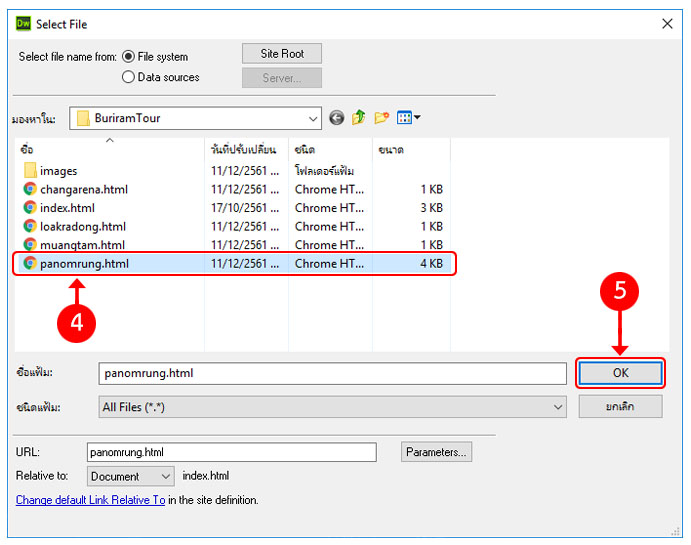 4 คลิกเลือกไฟล์เว็บเพจที่ต้องการเชื่อมโยง