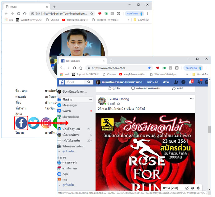 เมื่อเราคลิกที่ลิงค์ "ไอคอน Facebook" จะเปิดหน้าเว็บ facebook ขึ้นมา
