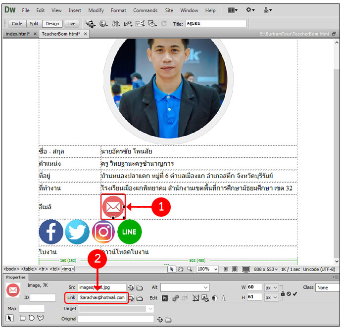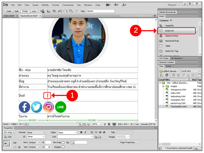 ใน Dreamweaver มีอีกวิธีให้เราสร้างลิงค์ส่งอีเมล์ได้อย่างสะดวก โดยให้เราเลือกตำแหน่งที่จะวางลิงค์นี้ จากนั้นคลิก