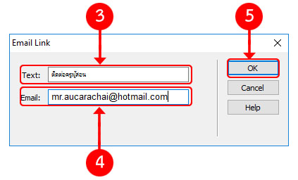 ที่เครื่องมือ (Email Link) ที่แท็บ Common หรือเลือกคำสั่ง Insert ->Email Link จะปรากฏไดอะบ็อกซ์ Email link ให้เรากรอกข้อความที่แสดงเป็นลิงค์ และอีเมล์แอดเดรสที่จะส่ง