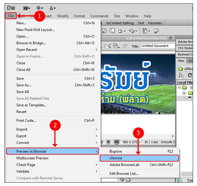 เมื่อเราบันทึกหน้าเว็บเพจที่เราสร้างเสร็จเรียบร้อยแล้ว ให้เปิดดูหน้าเว็บได้บนบราวเซอร์ โดยเลือกคำสั่ง File -> Preview in Browser -> ชื่อบราวเซอร์ที่ติดตั้งไว้ในเครื่อง (หรือกดคีย์ลัด <F12>)