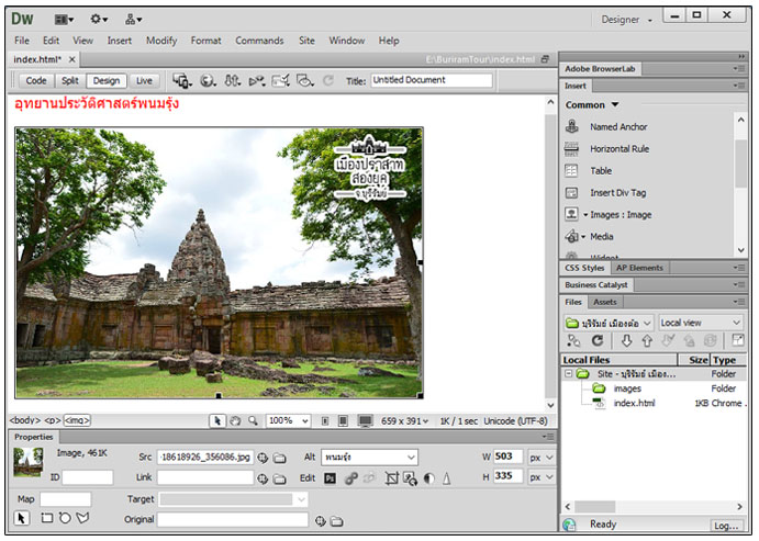 (image) ในแท็บ Common หรือคลิกคำสั่ง Insert -> Image หรือกดคีย์ลัด <Ctrl> + <Alt> + <I> แล้วเรียกใช้ไฟล์ภาพที่เราจัดเก็บอยู่ในโฟลเดอร์