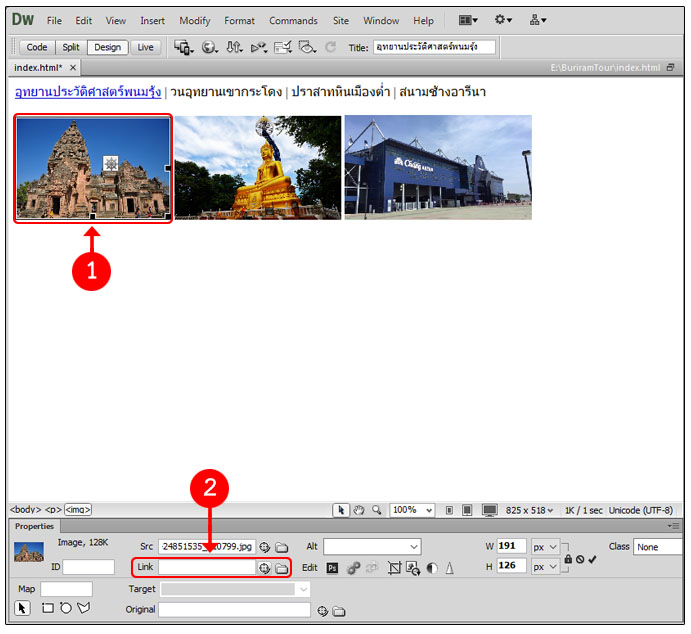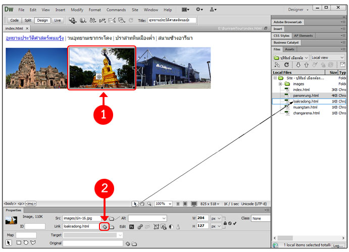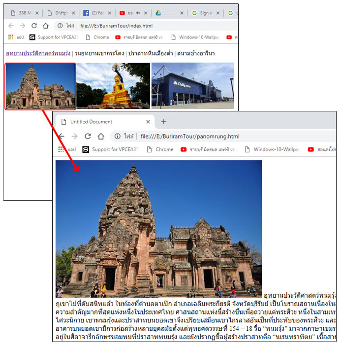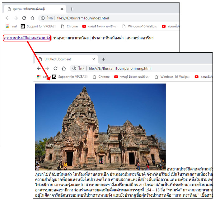 เมื่อเราคลิกที่ลิงค์ "อุทธยานประวัติศาสตร์พนมรุ้ง" จะเปิดหน้าเว็บ panomrung.html ขึ้นมา