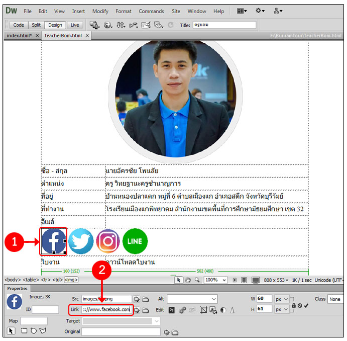 ยกตัวอย่างการเชื่อมโยงภาพ เพื่อไปยังเว็บไซต์ www.facebook.com ดังนี้