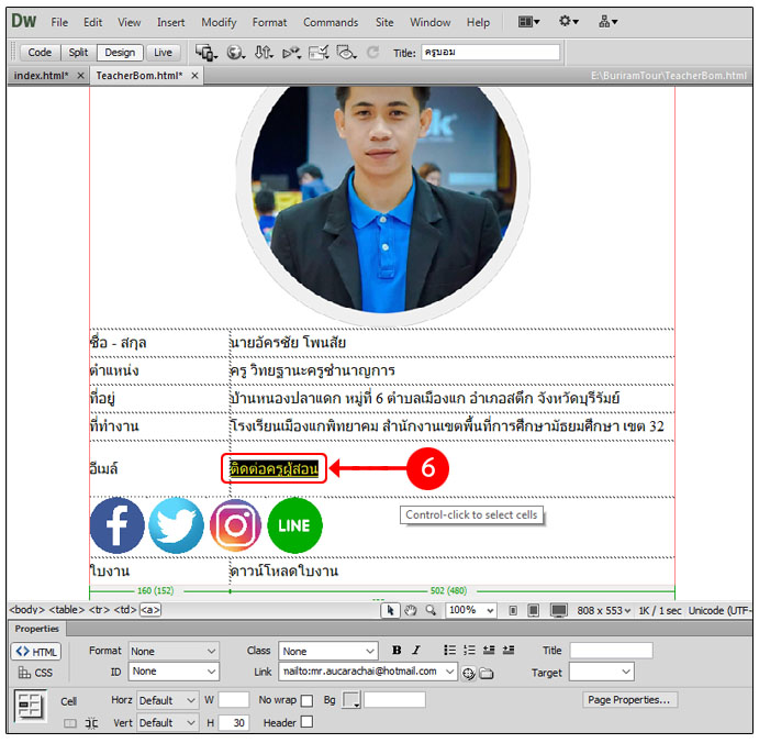 ใน Dreamweaver มีอีกวิธีให้เราสร้างลิงค์ส่งอีเมล์ได้อย่างสะดวก โดยให้เราเลือกตำแหน่งที่จะวางลิงค์นี้ จากนั้นคลิก