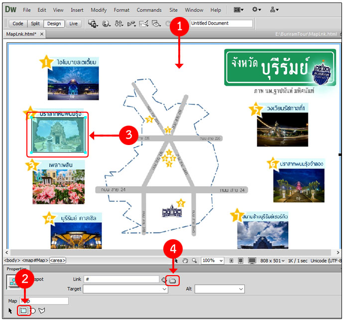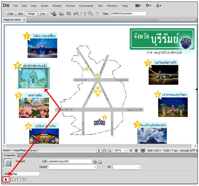 ดังตัวอย่างเราจะใช้เครื่องมือ Map Link วาดพื้นที่สี่เหลี่ยมลงบนภาพแผนที่การท่องเที่ยวจังหวัดบุรีรัมย์ เพื่อกำหนดบริเวณนั้นให้เป็นลิงค์ก์เชื่อมโยงไปยังหน้าเว็บเพจอื่น (เราสามารถ